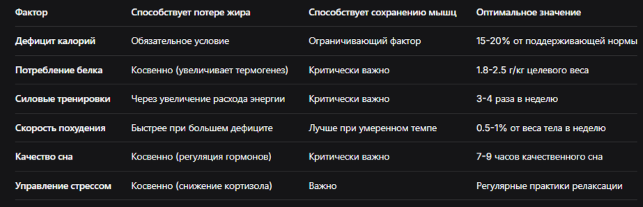 📊 Таблица: Факторы, влияющие на соотношение жир/мышцы при похудении