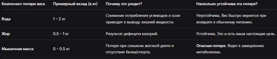 Цифра на весах после первой недели диеты может впечатлять, но важно понимать, из чего она складывается. Как правило, потеря веса составляет от 1 до 3 кг, но это не читый жир.