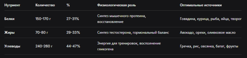 - Создание умеренного профицита (200-300 ккал) для роста мышц