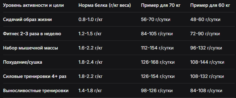 Таблица: Суточная норма протеина в зависимости от целей и уровня активности